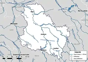 Les cours d'eau principaux de l'Yonne sont dans le bassin versant de la Seine[S 1] et la Loire[S 2] :