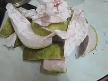 Enfin, l'albedo est riche en fibres dont, chez l'orange, le polydextrose au potentiel prébiotique élevé, il stimule la croissance et le métabolisme de L. acidophilus et B. animalis[12].