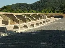 Le théâtre, dont le diamètre est de 68 mètres environ, pouvait contenir environ 3 000 spectateurs.