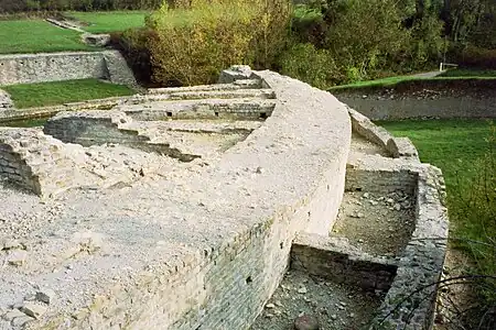 Sur la rive droite du ruisseau, des quatre murs demi-circulaires et concentriques qui supportaient les vingt-deux rangs de gradins de la cavea réservée aux sièges des spectateurs, un seul subsiste. On pouvait y accéder de l'extérieur par des passages voûtés (vomitoires) situées à l'arrière et desservies par des galeries extérieures dont cinq ont été identifiées. De l'orchestre où prenaient place sur des sièges d'honneur trois rangs de spectateurs privilégiés demeurent plusieurs grandes dalles en demi-cercle.