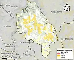 Le retrait-gonflement des sols argileux est susceptible d'engendrer des dommages importants aux bâtiments en cas d’alternance de périodes de sécheresse et de pluie. 19,5 % de la superficie communale est en aléa moyen ou fort (15,8 % au niveau départemental et 48,5 % au niveau national). Sur les 147 bâtiments dénombrés sur la commune en 2019, 40 sont en aléa moyen ou fort, soit 27 %, à comparer aux 14 % au niveau départemental et 54 % au niveau national. Une cartographie de l'exposition du territoire national au retrait gonflement des sols argileux est disponible sur le site du BRGM[28],[Carte 2].