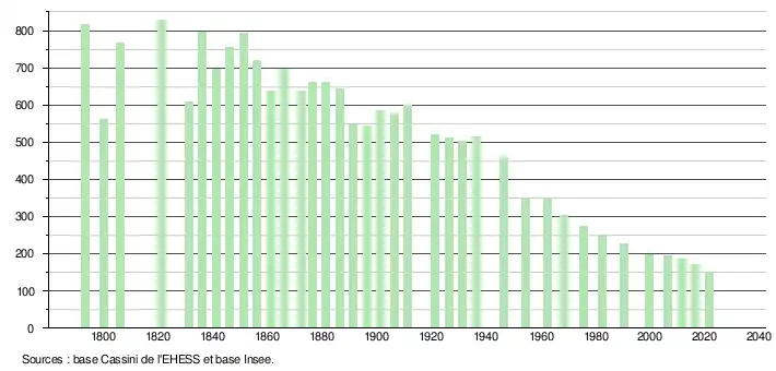 L'évolution du nombre d'habitants est connue à travers les recensements de la population effectués dans la commune depuis 1793. Pour les communes de moins de 10 000 habitants, une enquête de recensement portant sur toute la population est réalisée tous les cinq ans, les populations légales des années intermédiaires étant quant à elles estimées par interpolation ou extrapolation[36]. Pour la commune, le premier recensement exhaustif entrant dans le cadre du nouveau dispositif a été réalisé en 2006[37].