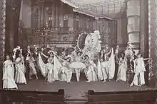 Une scène de la revue Bruxelles sans gêne de Malpertuis et Hannon (Théâtre de l'Alcazar, Bruxelles, 1894), montrant le Ballet des pierres précieuses. La mise en scène d'Albert Dubosq représente « La place de Brouckère, vue du Café Métropole ». Photographie de Georges Dupont-Émera conservée à la KBR, Bruxelles.