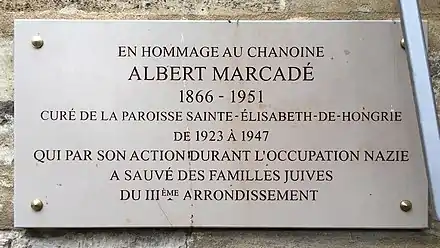 - « Anne Hidalgo dévoile une plaque en l’honneur du Chanoine Albert Marcadé » [PDF], sur paris.fr.