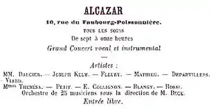 Le lieu est d'abord dirigé par le chanteur Joseph Mayer sous le nom d'Alcazar lyrique avant qu'Arsène Goubert n'en prenne les rênes. Ce dernier débauche la chanteuse Thérésa à son concurrent, l'Eldorado. Elle chante pour la première fois en tant que comique et remporte un triomphe, devenant la première véritable vedette de caf'conç.