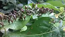 Les fleurs femelles sont très petites, en grappes pendantes sur les branches ou le tronc, de couleur verdâtre, tandis que les mâles sont en panicules axillaires pouvant atteindre 20 cm de long. Les fruits sont petits, capsulaires à deux loges subsphériques, couverts de fins poils étoilés, légèrement aplatis avec deux très longs styles persistants pouvant atteindre 7 cm de long.