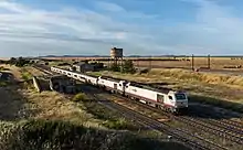 Un train dans la vieille gare d'Aldea del Cano. Il va de Madrid à Badajoz. À l'arrière plan on voit la LGV Madrid - Estrémadure en construction. Mai 2021.