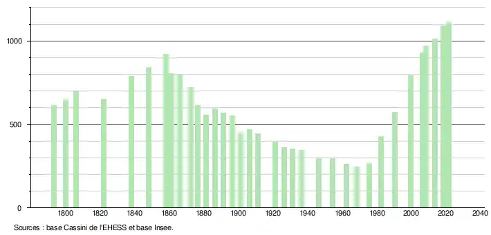 L'évolution du nombre d'habitants est connue à travers les recensements de la population effectués dans la commune depuis 1793. Pour les communes de moins de 10 000 habitants, une enquête de recensement portant sur toute la population est réalisée tous les cinq ans, les populations légales des années intermédiaires étant quant à elles estimées par interpolation ou extrapolation[16]. Pour la commune, le premier recensement exhaustif entrant dans le cadre du nouveau dispositif a été réalisé en 2008[17].