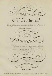 - Nouveau livre d'écriture avec différentes manières de faire des encres utiles et agréables. Paris : Basset, [1810], gravé par Davignon. Strasbourg BNU : FSO 1025 (sur Gallica).