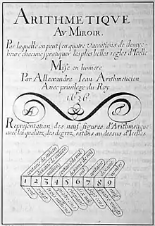 - Arithmétique au miroir, par laquelle on peut (en quatre vacations de demie heure chacune) pratiquer les plus belles règles d'icelle. Mise en lumière par Allexandre Jean, arithméticien.... [Paris], 1636-1637. 8°, [15]-55-17 p. gravées, 17 illustrations gravées. Paris BNF : V-19310. Réédition en 1649 (Paris BNF : V-19332). Cat. Warmelink n° 367a.