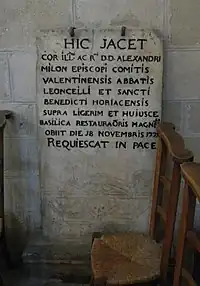 Il est décédé et inhumé à Saint-Benoît-sur-Loire « en l'église des révérends pères bénédictins devant la principale porte du chœur de ladite église[4] ». Puis son corps est probablement transféré à Valence. En effet, on trouve sa pierre tombale dans les collatéraux de la cathédrale Saint-Apollinaire de Valence :