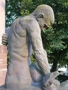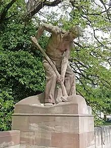 Alfred Marzolff obtient également des commandes de la ville de Haguenau dirigée par une municipalité de l'Union populaire républicaine (UPR), le Centre catholique autonomiste, dont une figure marquante est Jean Keppi (ancien adjoint au maire de Strasbourg Jacques Peirotes de 1919 à 1922 et secrétaire général du maire de Haguenau de 1922 à 1936)[107]. A. Marzolff échoue pour le monument de La Marseillaise, mais obtient les décorations (deux putti tenant des poissons) des bains-douches et les deux statues du lycée professionnel de Haguenau réalisés par l'architecte Gustave Oberthür.