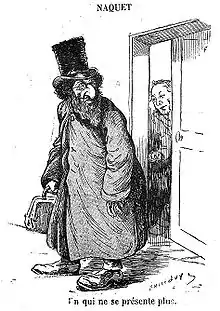 Alfred Naquet est poursuivi lors de l'affaire de Panama et acquitté en 1898. Il abandonne alors la vie politique et se consacre à l'écriture d'ouvrages socialistes et de traités de chimie. Il devient la cible des antisémites et des caricaturistes qui le représentent souvent en Quasimodo. Léon Daudet en fait l'une de ses cibles de prédilection lorsqu'il est question de défendre la famille et la patrie, conformément au « nationalisme intégral » prôné par l'Action française. Partisan de l’amour libre, ennemi du mariage, Naquet parvient à faire passer sa loi sur le divorce en France, le . Il s'attire les foudres des milieux catholiques et traditionalistes, qui tirent prétexte de ses origines juives, de son implication dans l'affaire de Panama et de ses liens avec les anarchistes pour l'accuser de conspiration. Les antisémites s'en prennent à lui comme auteur de la loi sur le divorce et le surnommant « l'ange du divorce et le démon du mariage ». Une caricature est publiée dans La Libre Parole le avec la légende : « Un qui ne se présente plus ». D'autres caricatures paraissaient déjà dans la revue Le Voleur en 1882[7].