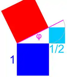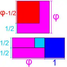 L'égalité φ2 = φ + 1 directement issue de l'égalité (1) se lit de la manière suivante : un carré de côté φ possède la même aire qu'un rectangle de base φ + 1 et de hauteur 1, résultat représenté sur la figure de gauche. En retranchant au carré et au rectangle, l'aire d'un gnomon du hauteur φ et de largeur 1/2, on remarque qu'un carré de côté φ – 1/2 possède une aire égale à la somme de celle d'un carré de côté 1 et de celle d'un carré de côté 1/2. Obtenir la longueur φ devient aisé avec le théorème de Pythagore, elle est construite sur la figure de droite.
