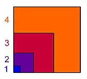 À l’aide de la figure permettant de calculer la liste des carrés, les Grecs définirent un nouveau nombre figuré, le nombre gnomon. Les pastilles bleues de la figure de gauche correspondent à un nombre gnomon : 9. Cette figure de gauche montre qu’un carré est formé d'une suite de nombres gnomons, correspondant à la suite des premiers nombres impairs[d 4]. Ce que l’on peut encore traduire par l’égalité :