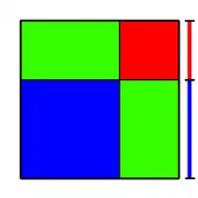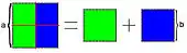 La longueur bleue représente a et la rouge b. L'expression (a + b)2 est égale à l'aire du grand carré de côté a + b. Il est possible de le décomposer en trois parties : la zone bleue, correspondant à un carré de côté a et d'aire a2; la zone rouge, correspondant à un carré de côté b et d'aire b2 et la zone verte, correspondant à deux rectangles de longueur a et de largeur b. Chaque rectangle de la zone verte est d'aire égale à ab, la zone verte est d'aire 2ab. On retrouve bien l'identité remarquable (1).
