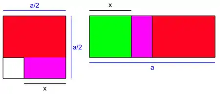 Dans un deuxième temps, on remarque que la longueur x obtenue est aussi la hauteur du rectangle rouge de gauche. Il est donc possible de déplacer la zone violette sur la figure de droite et d'ajouter à gauche de cette figure un carré de côté x. L'aire rouge et violette est, d'après la construction de la figure de gauche, égale à c. Par construction, la figure de droite est d'aire égale à c + x2. Cette aire est aussi égale à a.x, car la figure est un rectangle de base a et de hauteur x, ce qui donne la solution de l'équation. Ce mode de résolution provient directement du livre II des Éléments d'Euclide[19].