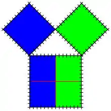 Une reconstitution de la possible démonstration archaïque, à base arithmétique géométrique, s'appuie sur la figure de gauche. Elle procède encore par l'absurde. On considère le plus petit nombre carré de côté a somme de deux nombres carrés de côté b. Le nombre carré de côté a est pair et donc a l'est aussi[Note 7]. Le côté b est impair, sinon, en choisissant une unité deux fois plus grande on trouverait une nouvelle valeur deux fois plus petite que a, dont le carré est la somme de deux carrés. Par ailleurs, un carré de côté b possède la même aire qu'un rectangle de hauteur a et deux fois plus grande que sa base (en bleu sur la figure). Un tel rectangle est composé de deux nombres carrés, il est donc pair et le carré de côté b l'est aussi, ainsi que b. Le côté b est un nombre à la fois pair et impair. Cette contradiction montre que b n'existe pas et termine la démonstration.