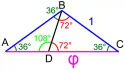 Si l'on trace la droite passant par B et divisant l'angle ABC de 108° en deux angles comme sur la figure de droite, l'un de 36° et l'autre de 72°, on divise le triangle initial en deux triangles isocèles ABD et DBC. Une analyse des angles montre que le triangle ABC est semblable au triangle ABD. Il est alors possible d'appliquer le théorème de Thales en remarquant que AB = 1, AC = AD + DC = φ et BC = CD = 1 car le triangle DBC est isocèle. Finalement : AD = φ – 1, et l'on obtient :