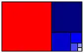 Après avoir placé le carré rouge, la zone restante est un carré de côté m et n – m. En multipliant par n/m, on remarque que le carré est homothétique à un carré de hauteur m et de base n. Ce résultat est une conséquence de l'égalité 1/(φ – 1) = φ. On en déduit que l'on peut ensuite placer un unique carré, en bleu foncé sur la figure et de côté n – m. On en déduit surtout que la procédure ne s'arrête jamais !