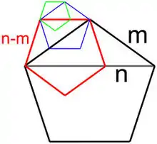 Il existe d'autres manières de conclure à partir de la construction précédente. On suppose toujours que φ est un nombre rationnel, noté n/m, et on construit un pentagone régulier de côté m et de diagonale n. La figure de droite montre comment construire un nouveau pentagone, de côté n – m et de diagonale m, le côté et la diagonale du nouveau pentagone sont toujours des entiers, mais cette fois-ci plus petits. L'on peut ainsi continuer indéfiniment. La suite des côtés forment alors une liste d'entiers positifs strictement décroissante et infinie, ce qui est impossible. Un tel raisonnement s'appelle en mathématique une descente infinie.