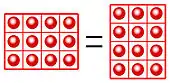 Pour se persuader de l’exactitude de ce résultat, on peut considérer des petits carrés, tous de même dimension, assemblés en rangées de 3. En accolant verticalement 4 rangées de 3, on obtient un rectangle de base 4 côtés de petits carrés et de hauteur 3. Ce rectangle, illustré sur la figure de gauche, contient 4 × 3 = 12 petits carrés. Appliquer un quart de tour au rectangle ne modifie pas le nombre de petits carrés le composant, ce qui montre que le résultat de 4 × 3 correspond au nombre de petits carrés composant le rectangle associé à l’opération 3 × 4. Ce résultat ne dépend pas des valeurs 3 et 4, on peut choisir deux nombres entiers quelconques que l’on peut noter a et b. L’égalité qui s’écrit de la manière suivante traduit ce que l’on appelle la commutativité de la multiplication :