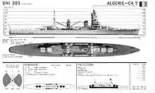 Le croiseur Algerie est l'aboutissement des travaux découlant de l'étude C4 qui plus qu'un croiseur lourd aboutit à un croiseur lourdement protégé, le nouveau croiseur est financé par la tranche navale votée dans le cadre de la loi du qui prévoit également la construction du croiseur mouilleur de mines Emile Bertin.