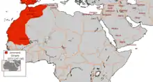 Les Almoravides[28](en arabe al-Murābitūn, المرابطون) sont une dynastie berbère, en provenance du Sahara, qui régnèrent sur le Sahara, une partie du Maghreb et une grande partie de la péninsule Ibérique (al-Andalus) (fin XIe siècle–début XIIe siècle).