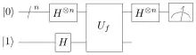 Nous commençons avec l'état à n+1 qubit . Les premiers qubits sont tous dans l'état et le dernier qubit dans l'état . Nous faisons passer chaque qubit dans une porte de Hadamard ce qui le met dans un état superposé, pour obtenir