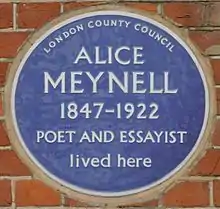 Suffragette, Alice Meynell est vice-présidente de la Women Writers' Suffrage League, fondée par Cicely Hamilton et active entre 1908 et 1919.