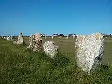En 1927-1928, le site est restauré sous la conduite de Bénard Le Pontois et de l'architecte des monuments historiques Gaston Chabal[13]. Lors de l'inauguration après restauration, le poète Saint-Pol-Roux, qui réside au manoir de Cœcilian voisin du site, prononce un discours. En 1956, le romancier Georges-Gustave Toudouze publie sur les alignements un article[14], assez lyrique, mélange de souvenirs de jeunesse, de détails sur les destructions survenues malgré le classement du site[Note 3]et d'affirmations personnelles[15]. Selon lui, le site aurait ainsi un caractère astronomique en lien avec la constellation des Pléiades[Note 4].