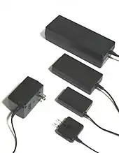 Fréquemment, ce bloc est un simple transformateur abaisseur de tension, associé à un redresseur délivrant une tension continue ; parfois, un régulateur de tension complète ces alimentations. Depuis la fin de la première décennie du XXIe siècle, toutes ces petites alimentations sont des alimentations à découpage beaucoup plus légères.