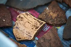 Plusieurs fragments de céramique ont été mis au jour lors de la fouille de 2019. D’après leurs caractéristiques, ces fragments se rapportent aux périodes néolithique et protohistorique, mais aussi à l’époque médiévale. La plupart de ces fragments ont été retrouvés en position secondaire, hors stratigraphie, et sont à dégraissant de sable ou de coquille. Un petit amas de céramique a toutefois été retrouvé en position primaire, au pied de ce qui semble être la façade du cairn de l’allée couverte. Les remontages ont révélé qu’il s’agissait de deux vases mélangés, l’un matérialisé par un gros morceau de panse, et l’autre par deux petits boutons d’argile.