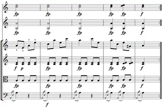 Les deux caractéristiques que nous venons de mentionner peuvent être observées dans l'extrait suivant de la musique turque dans le Concerto pour violon n° 5 de Mozart :