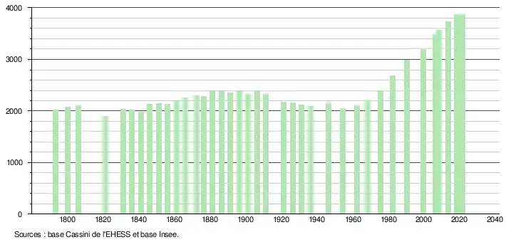 L'évolution du nombre d'habitants est connue à travers les recensements de la population effectués dans la commune depuis 1793. Pour les communes de moins de 10 000 habitants, une enquête de recensement portant sur toute la population est réalisée tous les cinq ans, les populations légales des années intermédiaires étant quant à elles estimées par interpolation ou extrapolation[37]. Pour la commune, le premier recensement exhaustif entrant dans le cadre du nouveau dispositif a été réalisé en 2008[38].