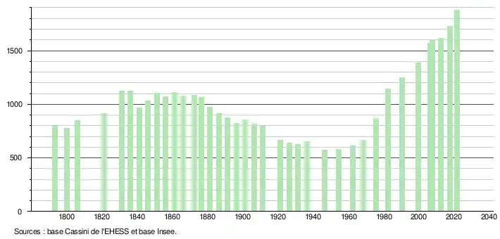 L'évolution du nombre d'habitants est connue à travers les recensements de la population effectués dans la commune depuis 1793. Pour les communes de moins de 10 000 habitants, une enquête de recensement portant sur toute la population est réalisée tous les cinq ans, les populations légales des années intermédiaires étant quant à elles estimées par interpolation ou extrapolation[26]. Pour la commune, le premier recensement exhaustif entrant dans le cadre du nouveau dispositif a été réalisé en 2007[27].