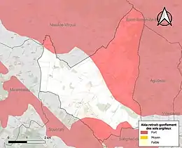 Le retrait-gonflement des sols argileux est susceptible d'engendrer des dommages importants aux bâtiments en cas d’alternance de périodes de sécheresse et de pluie. 47,9 % de la superficie communale est en aléa moyen ou fort (54,2 % au niveau départemental et 48,5 % au niveau national). Sur les 119 bâtiments dénombrés sur la commune en 2019, 77 sont en aléa moyen ou fort, soit 65 %, à comparer aux 57 % au niveau départemental et 54 % au niveau national. Une cartographie de l'exposition du territoire national au retrait gonflement des sols argileux est disponible sur le site du BRGM[12],[Carte 2].
