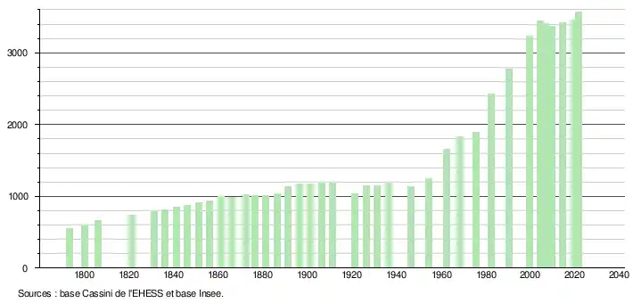 L'évolution du nombre d'habitants est connue à travers les recensements de la population effectués dans la commune depuis 1793. Pour les communes de moins de 10 000 habitants, une enquête de recensement portant sur toute la population est réalisée tous les cinq ans, les populations légales des années intermédiaires étant quant à elles estimées par interpolation ou extrapolation[25]. Pour la commune, le premier recensement exhaustif entrant dans le cadre du nouveau dispositif a été réalisé en 2004[26].