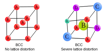 Étant donné que l'on trouve généralement dans les HEA des phases de solution solide avec plusieurs éléments principaux, le concept de structure cristalline conventionnelle est donc étendu d'une base à un ou deux éléments à une base à plusieurs éléments. Chaque atome est entouré de différents types d'atomes et subit donc des déformations et des contraintes de réseau, principalement en raison de la différence de taille des atomes. Mais outre la différence de taille des atomes, les différences d'énergie de liaison et de tendance de la structure cristalline entre les éléments constitutifs peuvent également provoquer une distorsion du réseau encore plus importante, car des liaisons et une structure électronique non symétriques existent entre un atome et ses premiers voisins. Cette distorsion serait à l'origine de certains comportements mécaniques, thermiques, électriques, optiques et chimiques des HEA. Ainsi, la distorsion globale du réseau serait plus importante que dans les alliages traditionnels dans lesquels la plupart des atomes de la matrice ont le même type d'atomes que ceux qui les entourent[9].