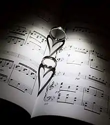 Deux alliances dessinant des cœurs dans une partition de musique.
