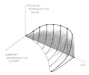 Le trade-off entre la reproduction courante et l’espérance d’une reproduction future à un âge donné, peut être représenté graphiquement en représentant la valeur reproductive résiduelle en fonction de l’effort reproducteur courant à un instant (ou un âge) donné[3]. Les formes hypothétiques du trade-off représentent les différentes possibilités avec lesquelles varient les bénéfices en matière de reproduction future par rapport aux coûts sur la reproduction courante (et vice versa). En tout point de cette relation, la seule façon d’augmenter la valeur reproductive résiduelle est de diminuer l’effort reproducteur courant, et vice versa.