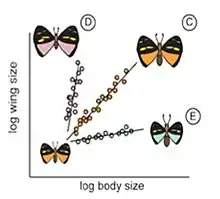 - Quand x et y sont des caractères mesurés chez le même individu à différents temps de développement, la relation est appelée allométrie ontogénique (dans l’allométrie ontogénique, k est la différence de taux de croissance entre un organe et la taille du corps).