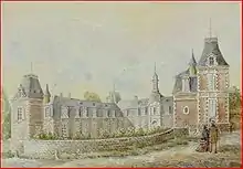 Le château était en brique et pierre, comportant un rez-de-chaussée et un étage, un corps de logis principal avec pavillon carré formant tourelle à chaque extrémité, et deux corps de logis en retour, terminés eux aussi par un même pavillon, de sorte que les bâtiments formaient les trois côtés d'une cour d'honneur carrée de cent pieds de côté, ouverte au sud vers l'église et le village.