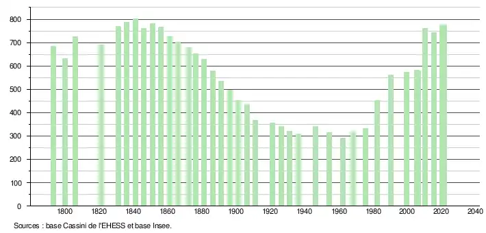 L'évolution du nombre d'habitants est connue à travers les recensements de la population effectués dans la commune depuis 1793. Pour les communes de moins de 10 000 habitants, une enquête de recensement portant sur toute la population est réalisée tous les cinq ans, les populations légales des années intermédiaires étant quant à elles estimées par interpolation ou extrapolation[21]. Pour la commune, le premier recensement exhaustif entrant dans le cadre du nouveau dispositif a été réalisé en 2005[22].