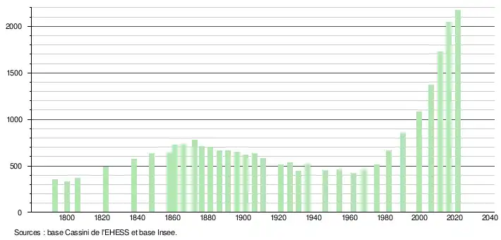 L'évolution du nombre d'habitants est connue à travers les recensements de la population effectués dans la commune depuis 1793. Pour les communes de moins de 10 000 habitants, une enquête de recensement portant sur toute la population est réalisée tous les cinq ans, les populations légales des années intermédiaires étant quant à elles estimées par interpolation ou extrapolation[17]. Pour la commune, le premier recensement exhaustif entrant dans le cadre du nouveau dispositif a été réalisé en 2006[18].