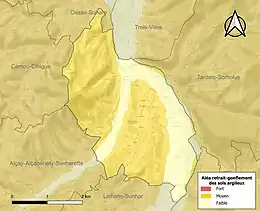 Le retrait-gonflement des sols argileux est susceptible d'engendrer des dommages importants aux bâtiments en cas d’alternance de périodes de sécheresse et de pluie[39]. 70,7 % de la superficie communale est en aléa moyen ou fort (59 % au niveau départemental et 48,5 % au niveau national)[Carte 5]. Depuis le , en application de la loi ELAN, différentes contraintes s'imposent aux vendeurs, maîtres d'ouvrages ou constructeurs de biens situés dans une zone classée en aléa moyen ou fort[Note 7],[40].