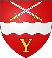 De gueules à la fasce ondée d’argent, accompagnée en chef de deux épées d’argent garnies d’or, passées en sautoir, et en pointe de la lettre Y d’or.