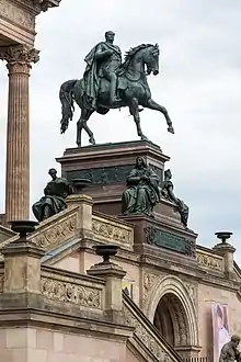 Sur la volée d'escalier est érigée la statue équestre de Frédéric-Guillaume IV avec, au piédestal, les allégories de la Religion, de l'Art, de l'Histoire et de la Philosophie : la statue a été exécutée entre 1875 et 1886 par Alexander Calandrelli d'après un dessin de Gustav Blaeser.