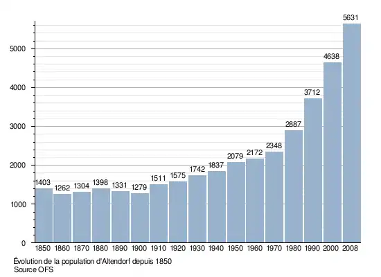 Selon l'Office fédéral de la statistique, Altendorf compte 7 215 habitants fin 2022[1]. Sa densité de population atteint 354 hab./km2.