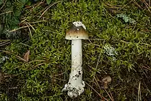 Le pied, grêle, mince et chétif, mesure de 50 à 100 mm de haut (jusqu'à 140 mm au Québec) pour de 5 à 12 mm d'épais. Il est cylindrique, plein au début, creux avec l'âge, cassant, un peu épaissi vers la base et parfois terminé par un petit bulbe. Sa surface est recouverte sur toute sa hauteur d'un tomentum laineux floconneux gris brun sur fond blanchâtre issu du voile général. Son sommet est plus ou moins lisse. Sa base est recouverte d'une petite volve aprimée, adnée, en forme de sac plus ou moins développé et très friable, peu ferme, gris crème ou brun grisâtre généralement réduite à des traces en forme d'anneau ou à des bandes floculées dispersées[1],[14],[10],[15],[9].